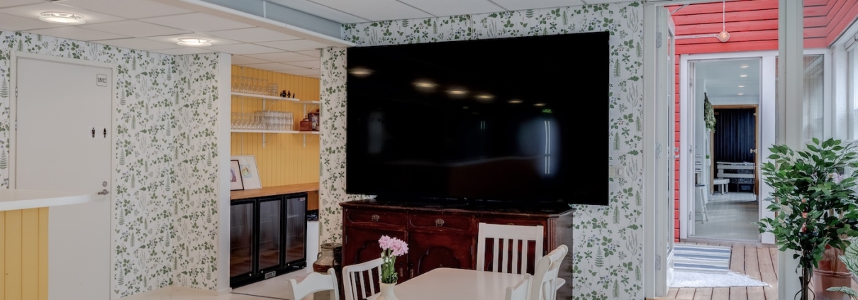 Varaukseen sisältyy kaikki tarvittava: pyyhe- ja laudeliinasetti sekä shampoot. Käytössä on myös wi-fi ja 98 tuumainen näyttö mikä mahdollistaa esitysten pitämisen rentoutuneessa ympäristössä. Cateringin voi tilata tai tuoda oman kokoustarjoilun mukaan.