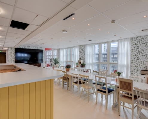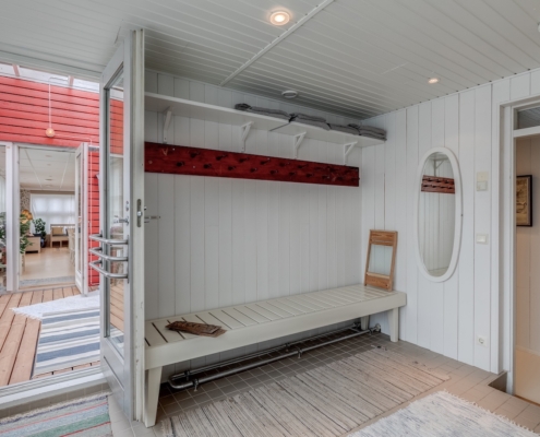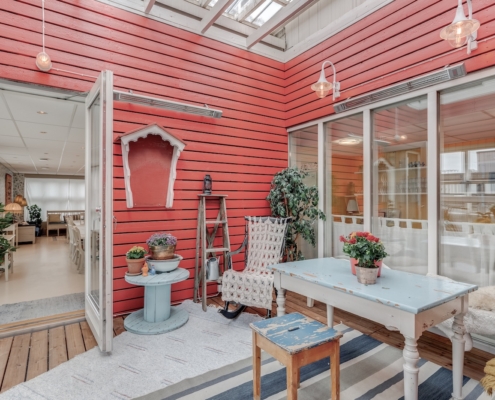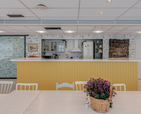 Mökkiteemainen kokoustila ja oleskelutila Sauna Pasilassa, Helsingissä.